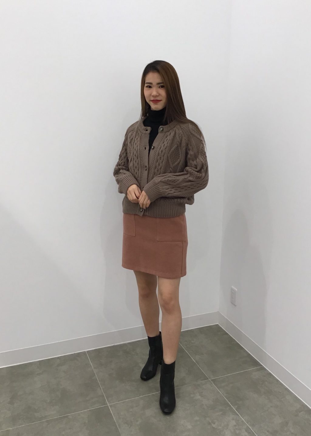 厚手の起毛素材のミニスカートに、大きなフロントポケットが足を綺麗に細く見せてくれます♡