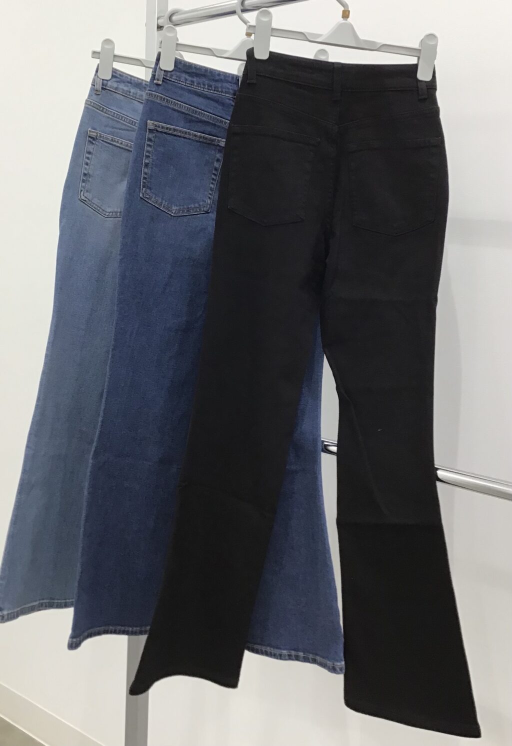 高めのひざ位置から裾に向かって広がるフレアシルエットで