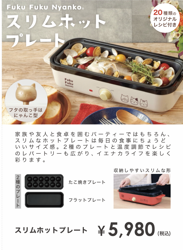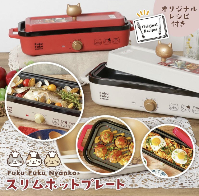 ふたのつまみが「ふくふくにゃんこ」でかわいい、スリムタイプのホットプレート。