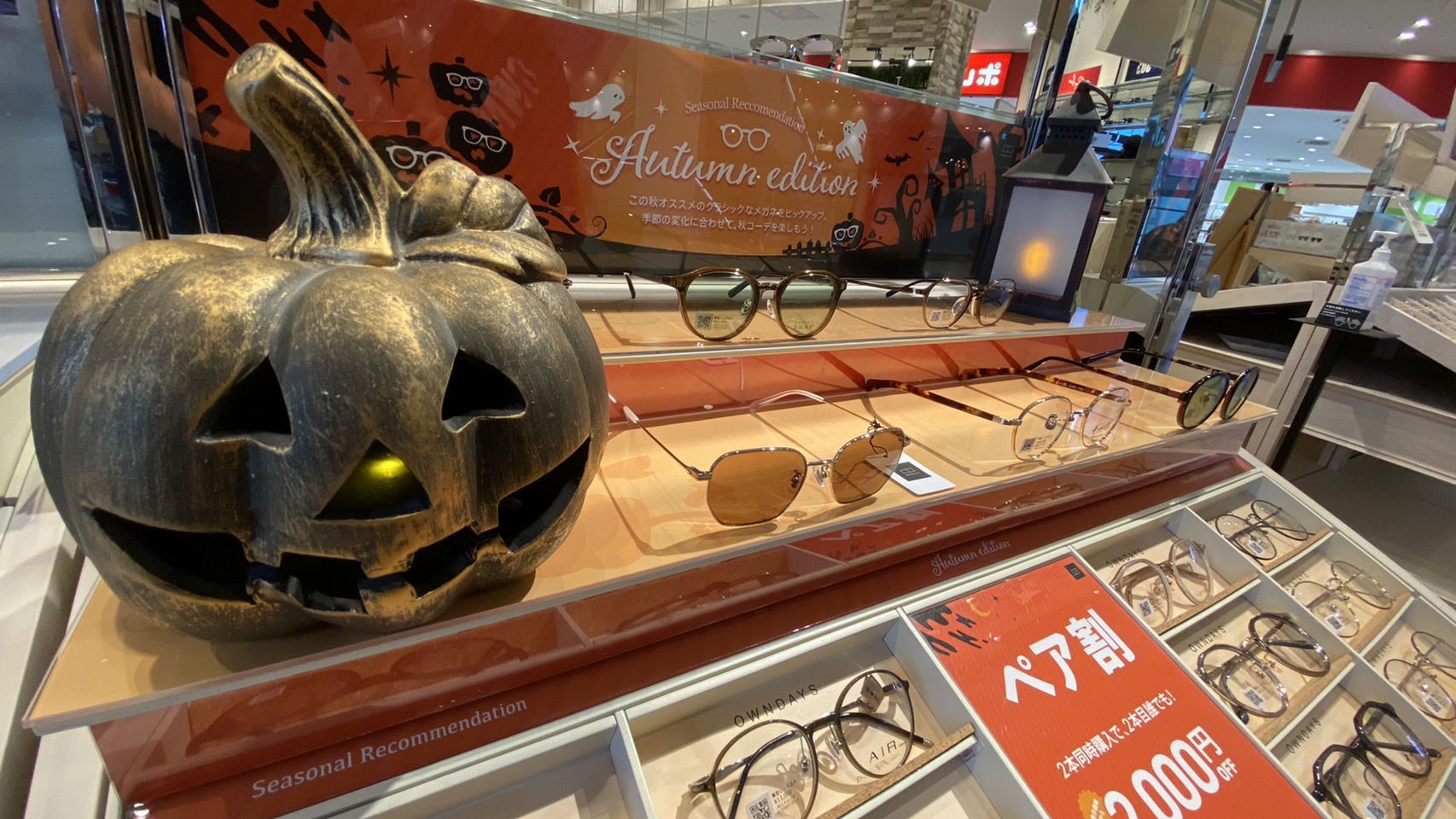 ハロウィンを感じれるようにお店の入り口がハロウィン仕様になっています(*’▽’)只今OWNDAYSではハロウィンのペア割りを開催中です!