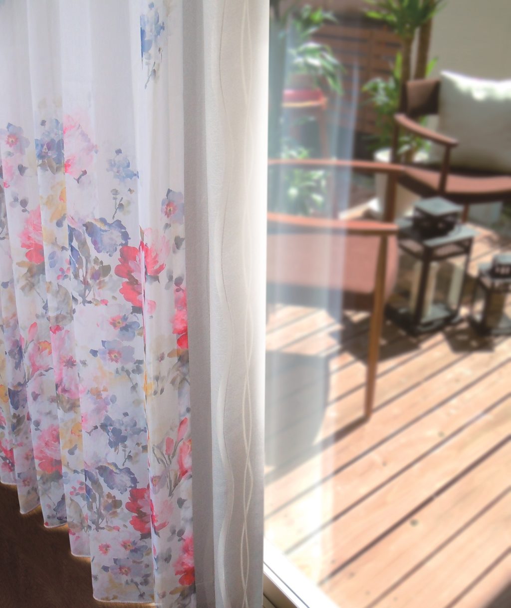 春らしい軽やかなボイル生地に大胆な花柄が描かれたレースカーテンはリビングにおすすめ。